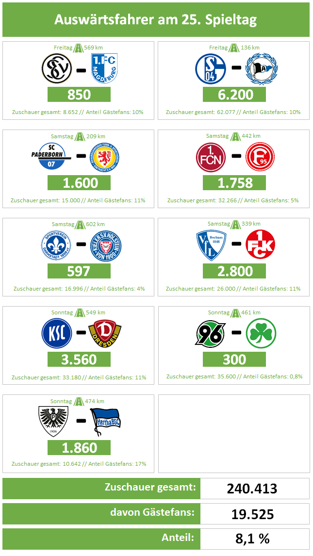 Anmerkung: Die Zahlen erhalten wir i.d.R. direkt von den Vereinen (entweder dem Heim- oder Gastverein). Uns ist bewusst, dass sich auch in frei zugänglichen Bereichen der Stadien Fans der jeweiligen Gastvereine aufhalten und die jeweiligen Angaben von der tatsächlichen Anzahl an Gästefans abweichen können. Da wir eine solche "Dunkelziffer" aber nur sehr ungenau schätzen könnten, verzichten wir darauf und verlassen uns auf verlässliche und nachweisbare Quellen.