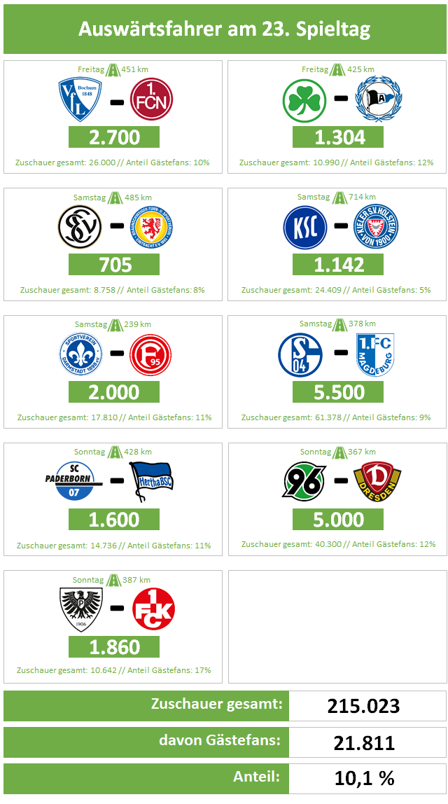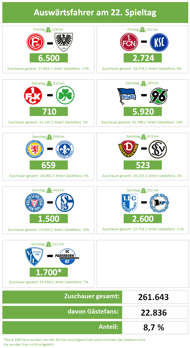 Anmerkung: Die Zahlen erhalten wir i.d.R. direkt von den Vereinen (entweder dem Heim- oder Gastverein). Uns ist bewusst, dass sich auch in frei zugänglichen Bereichen der Stadien Fans der jeweiligen Gastvereine aufhalten und die jeweiligen Angaben von der tatsächlichen Anzahl an Gästefans abweichen können. Da wir eine solche "Dunkelziffer" aber nur sehr ungenau schätzen könnten, verzichten wir darauf und verlassen uns auf verlässliche und nachweisbare Quellen.