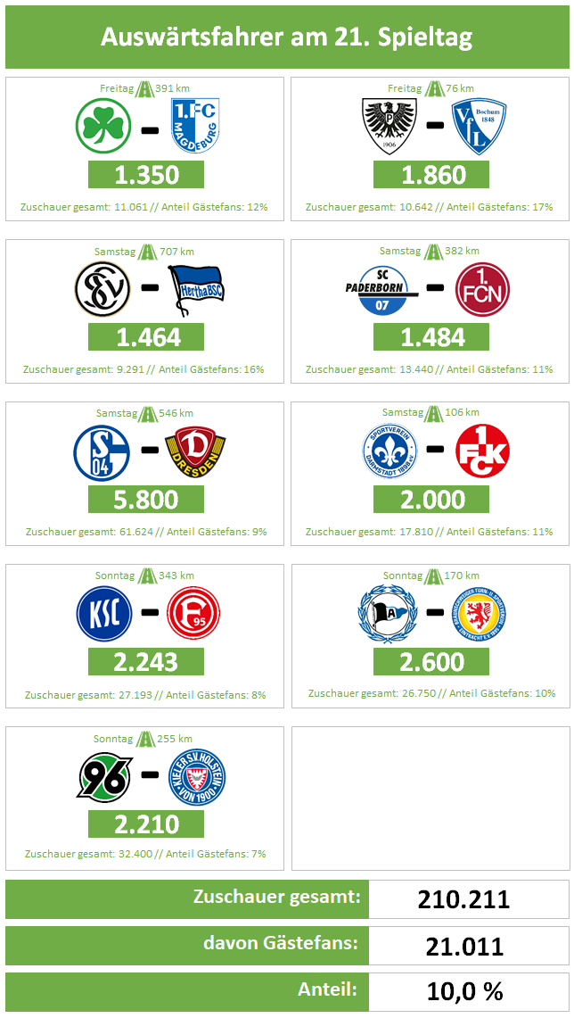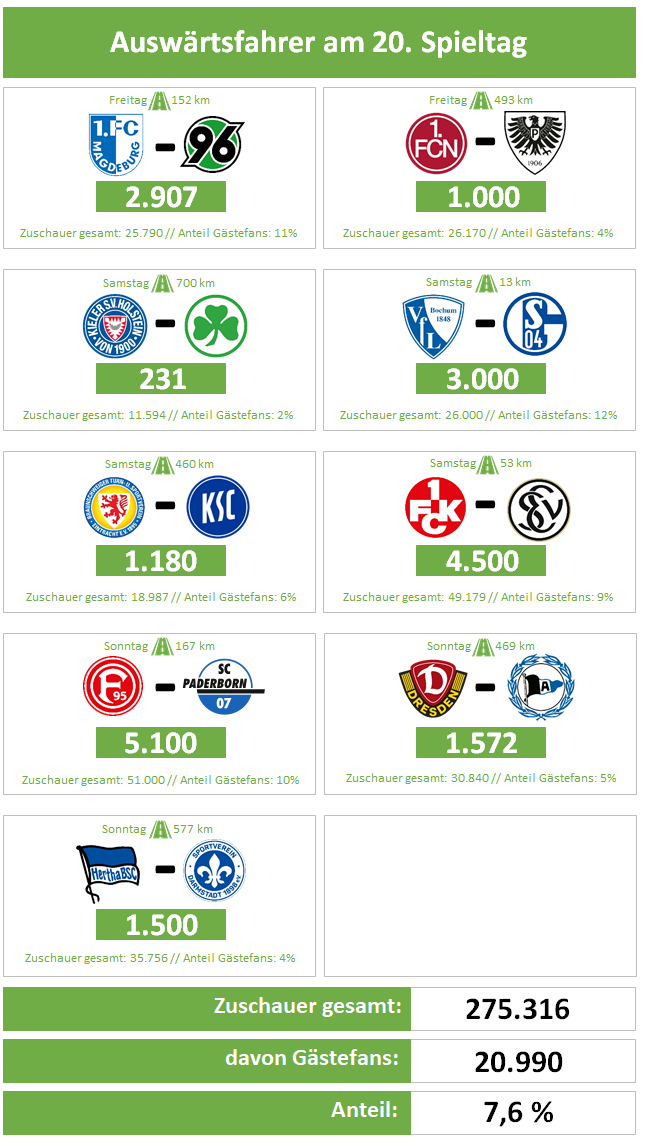 Anmerkung: Die Zahlen erhalten wir i.d.R. direkt von den Vereinen (entweder dem Heim- oder Gastverein). Uns ist bewusst, dass sich auch in frei zugänglichen Bereichen der Stadien Fans der jeweiligen Gastvereine aufhalten und die jeweiligen Angaben von der tatsächlichen Anzahl an Gästefans abweichen können. Da wir eine solche "Dunkelziffer" aber nur sehr ungenau schätzen könnten, verzichten wir darauf und verlassen uns auf verlässliche und nachweisbare Quellen.