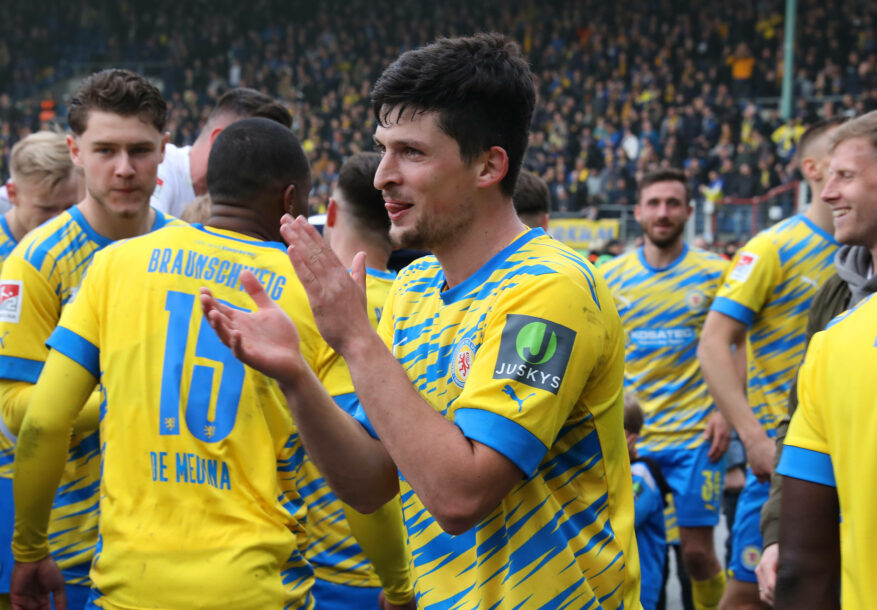Nach dem Last-Minute-Coup brachen an der Hamburger Straße alle Dämme: Bei Eintracht Braunschweig herrschte durch den umjubelten 1:0-Triumph im hochemotionalen Derby gegen Hannover 96 und den nicht minder wichtigen Sprung immerhin auf den Abstiegsrelegationsplatz im Mannschaftskreis wie bei den Fans auf den Tribünen Glückseligkeit pur.